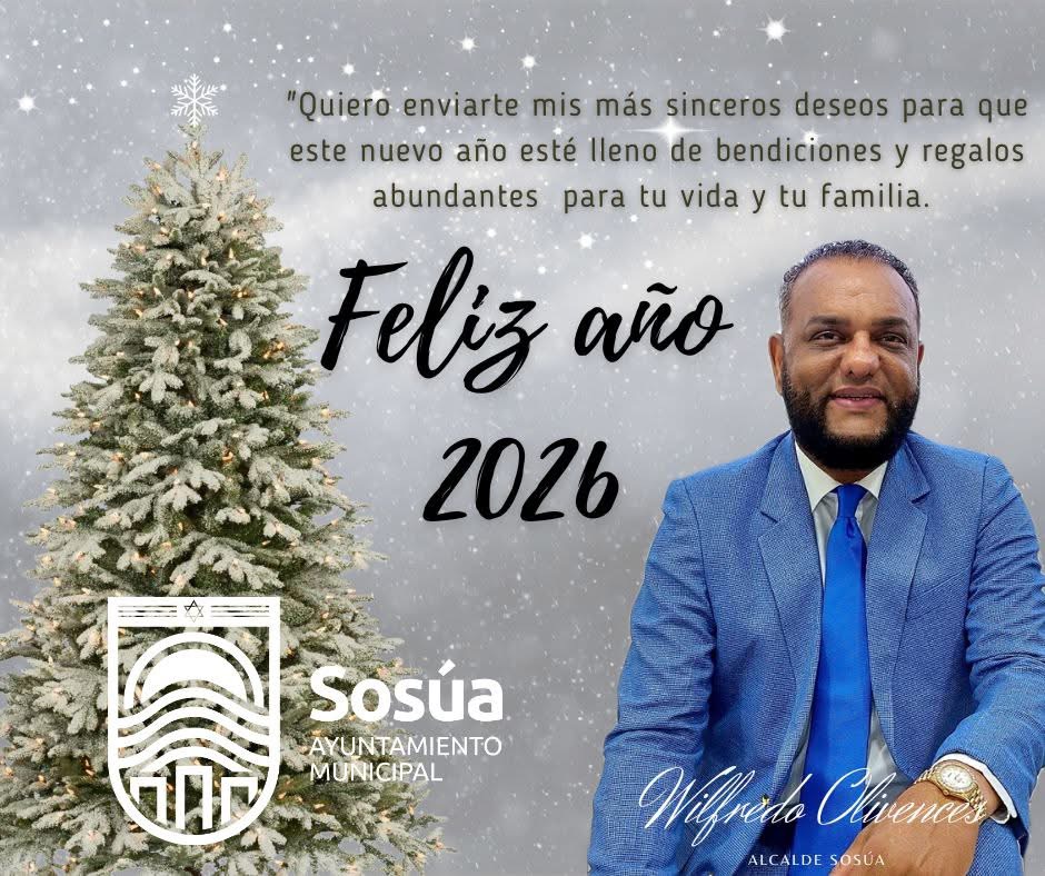 El Alcalde de Sosúa Wilfredo Olivense envía sus más sinceros deseos de bienestar, paz y bendiciones para toda la familia del municipio. En este año 2026, feliz Año Nuevo, Ayuntamiento municipal de Sosúa.