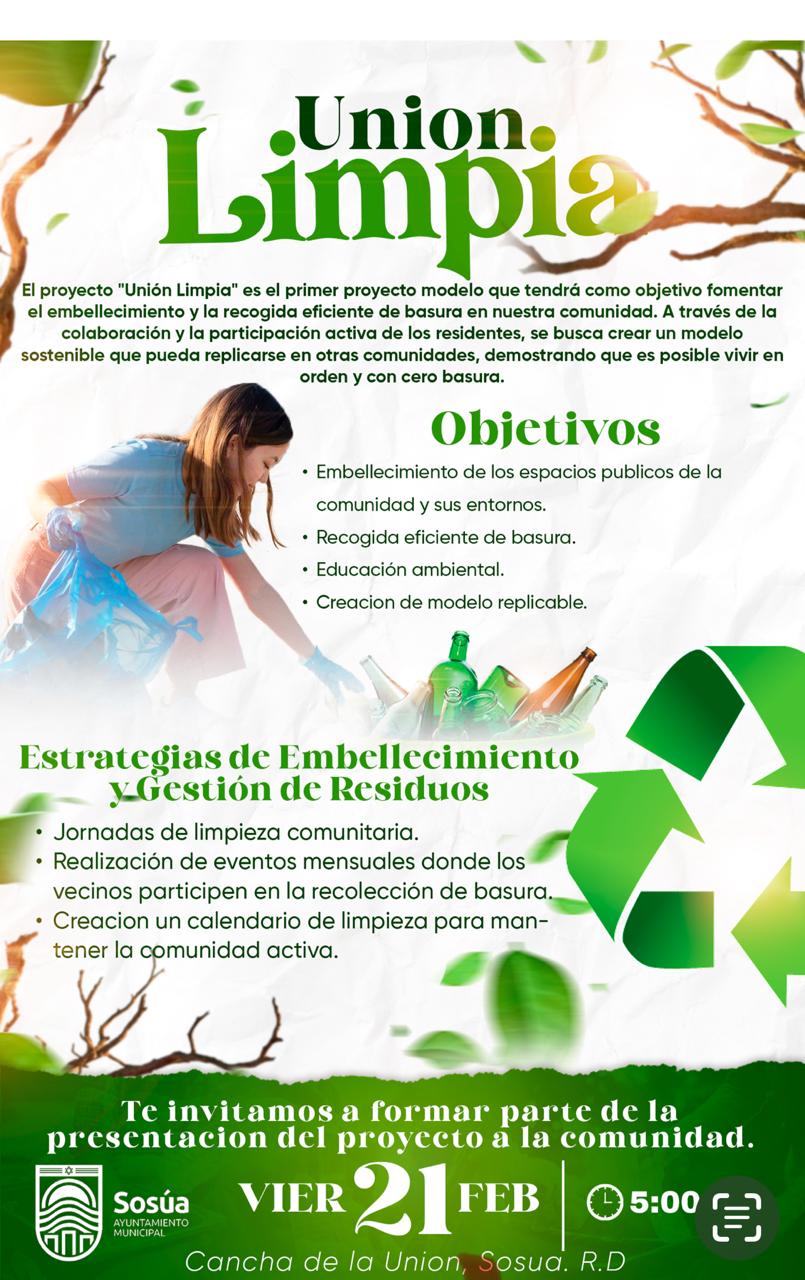 La comunidad de La Unión y sus líderes locales invitan a todos los ciudadanos, medios de comunicación y sectores interesados a la presentación oficial del proyecto “Unión Limpia”, una iniciativa dedicada a mejorar nuestro entorno y promover un Sosúa más limpio y sostenible.