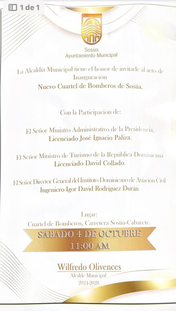 Tiene el honor de invitarle al acto de Inauguración del Nuevo Cuartel de Bomberos de Sosúa.